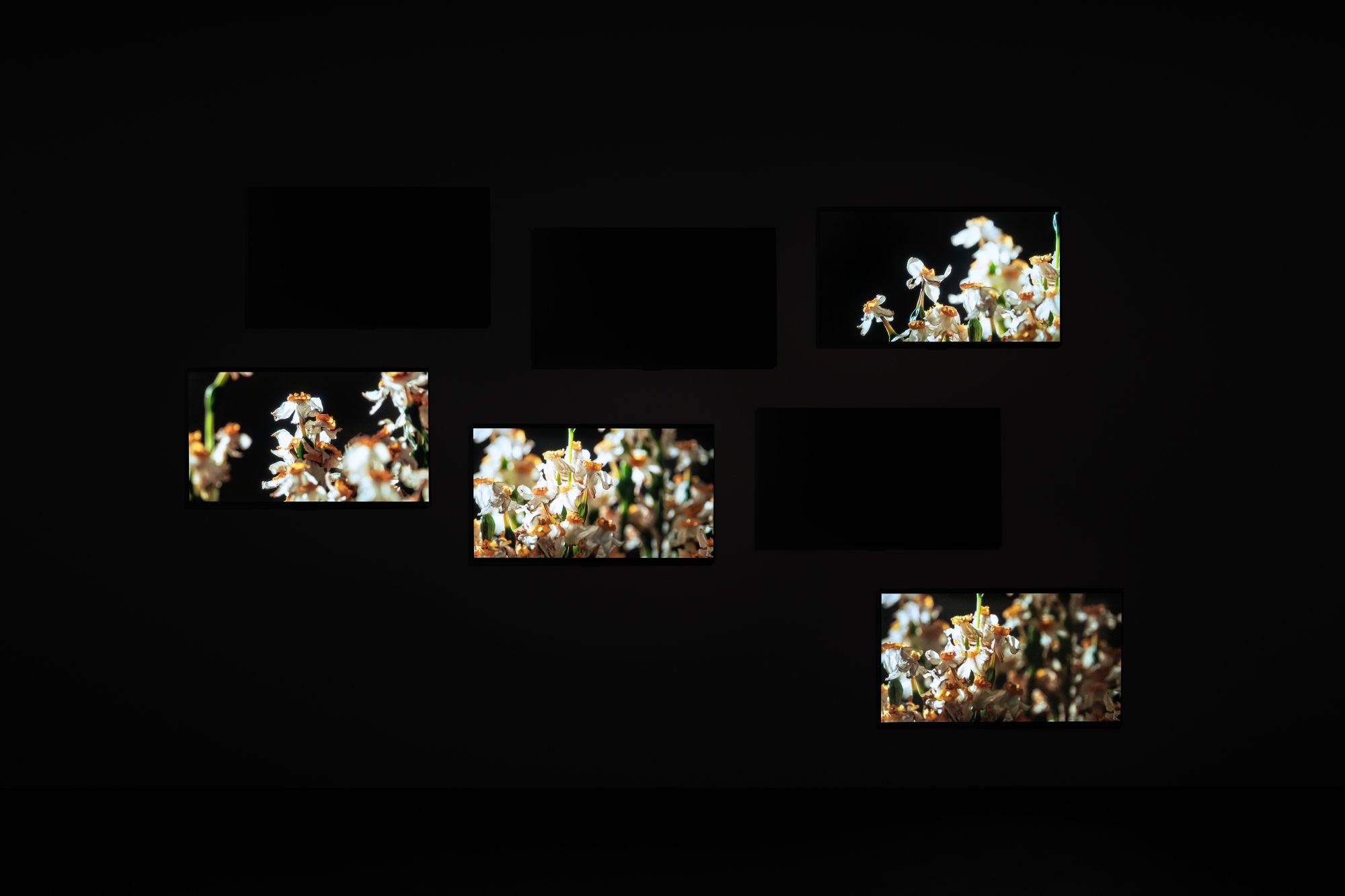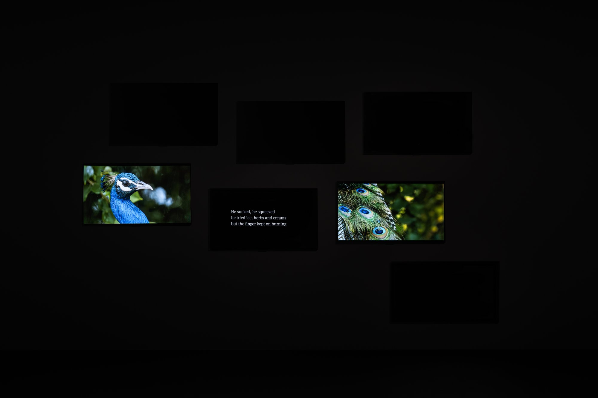 Immersa nell’oscurità viene presentata l’opera più recente dell’artista The Peacock’s Graveyard (2023). Una riflessione contemporanea sulla morte, l’impermanenza e il ciclo della vita, quest’opera è l’ultima realizzata dall’artista e fa parte della Collezione Pinault. Sette schermi invisibili, contenendo immagini o testi, tessono una coreografia fluttuante che evoca la magia del proto-cinema. Un raga (musica classica indiana melodica basata sull’improvvisazione) potente e vibrante eseguito dal pianista Utsav Lal impone un ritmo lento che evolve in una trance. Sfruttando appieno il potenziale di questa narrazione multifocale, Amar Kanwar non filma figure né usa voci, ma il testo è accompagnato da immagini metaforiche e astratte. In questi cinque racconti scritti dall’artista (per un’esperienza totale di 28 minuti), si incontrano un sacerdote furioso, un boia a cui un albero impartisce una lezione, un proprietario terriero che tradisce una promessa, un presidente reincarnato e due amici salvati dalle loro liti. Kanwar descrive queste favole semplici e metafisiche come strumenti che ci aiutano a regolare il rapporto con il mondo, la sua violenza e le sue relazioni di potere — piccole storie per adulti da portare via con sé.