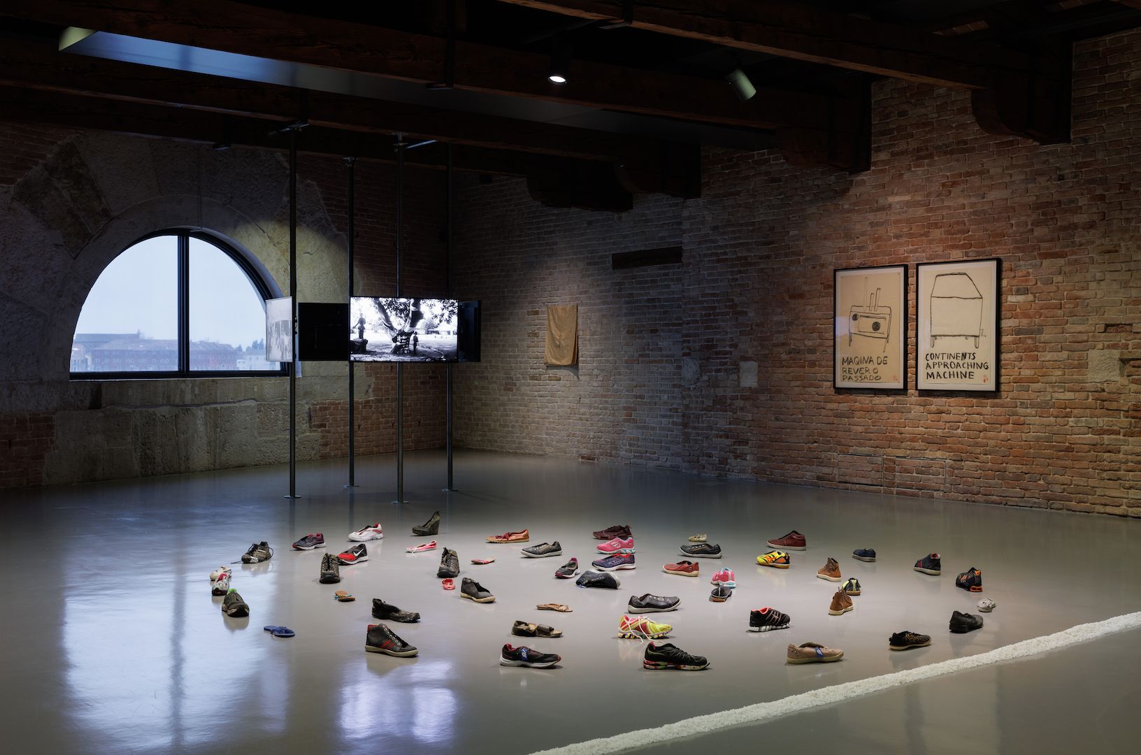 La mostra non presenta né un approccio cronologico né tematico, ma stazioni in un continuum, una distillazione lungo il percorso espositivo di una performance arte-vita in corso. Centrale tra queste è Notícias de América della Pinault Collection, che condensa i dieci mesi di cammino di Nazareth dal Brasile a New York. Fotografie, testi e Havaianas consumate tracciano momenti in cui identità e confini si scontrano, offrendo una testimonianza diretta della migrazione come esperienza vissuta e come finzione costruita.